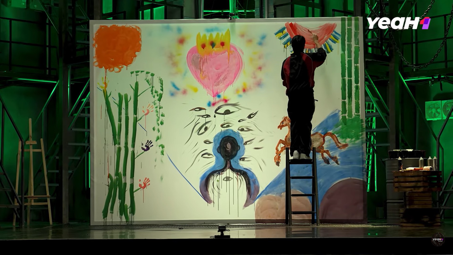 Hoàng Hiệp dùng bàn tay ấn lên những "bước chân" mò mẫm sặc sỡ ẩn dụ cho hành trình tưởng khó nhằn hóa ra lại khá xuôi chèo mát mái của anh trong chương trình.