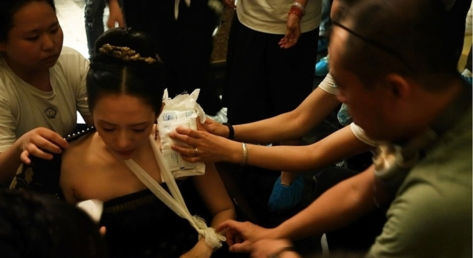 Sau cú ngã bất ngờ, cô nằm bất động dưới sàn một lúc. Các nhân viên và diễn viên vội vã chạy tới đỡ cô dậy. Lúc này, nữ diễn viên tỏ ra đau đớn và khóc khi được ê-kíp sơ cứu.