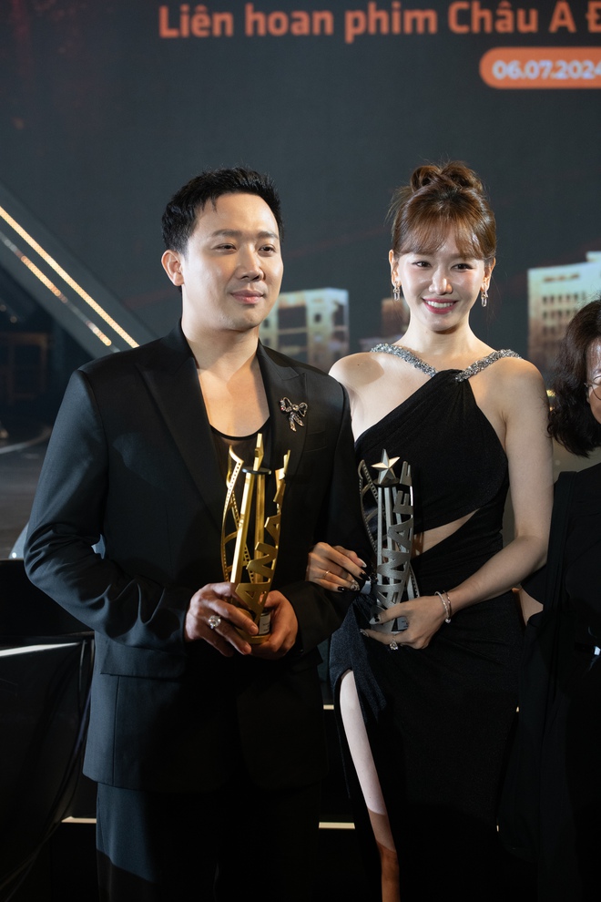 | Trấn Thành dí dỏm cảm ơn Hari Won khi nhận giải Phim Việt Nam hay nhất tại LHP châu Á Đà Nẵng 2024. |
