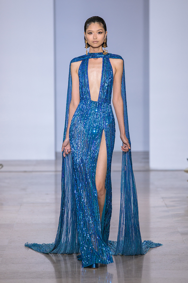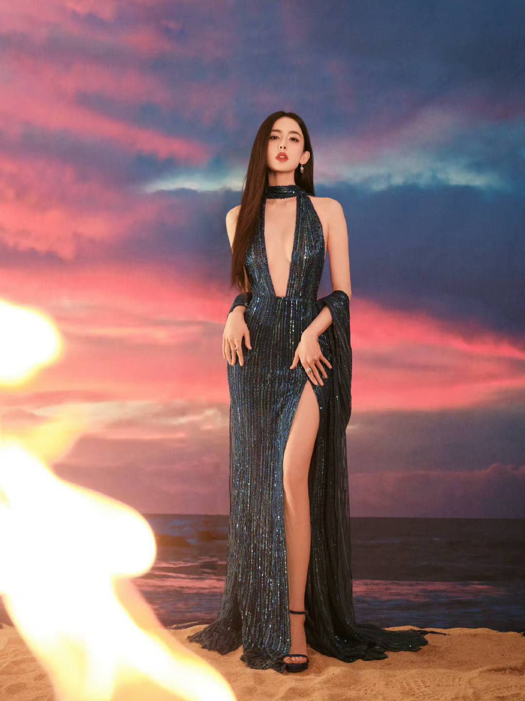 Đây chính là thiết kế cắt khoét táo bạo nhất trong lịch sử thảm đỏ của Cổ Lực Na Trát. Bộ cánh khoét ngực sâu hun hút lấp ló thềm ngực gợi cảm, đường xẻ cao hiểm hóc đối xứng hai bên khiến mỗi bước di chuyển của mỹ nhân Tân Cương quyến rũ đến tột cùng.
