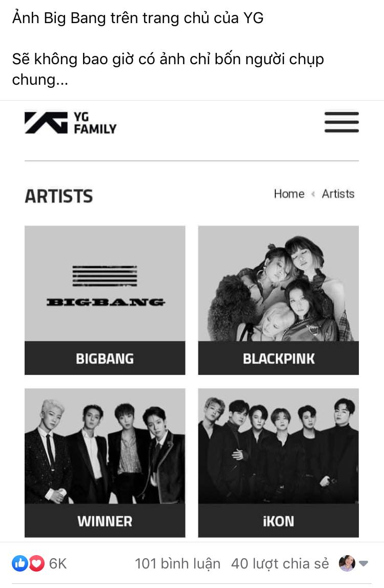 Ngoài ra, fan còn phát hiện trên trang chủ YG, ảnh đại diện của Big Bang cũng không có sự xuất hiện của 4 thành viên, thay vào đó là biểu tượng 5 dòng kẻ.