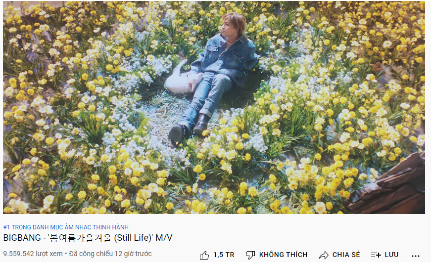 MV Still Life của BIGBANG hiện đã thu về hơn 9 triệu lượt xem và đang giữ vị trí top 1 trending YouTube trong danh mục âm nhạc thịnh hành. Still Life trở thành MV có lượng người xem cao nhất trong 24h vừa qua trên YouTube với 8.4 triệu.