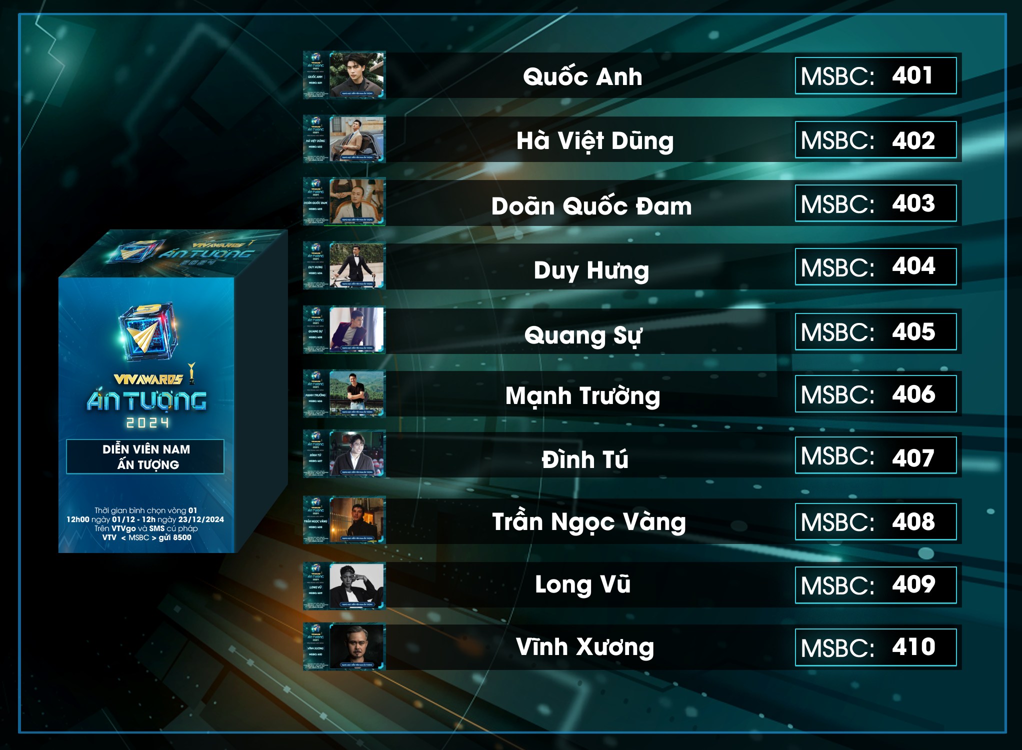 Ở hạng mục Diễn viên nam ấn tượng gây chú ý với sự xuất hiện của diễn viên 10X đầu tiên được đề cử VTV Awards. Đó là diễn viên Long Vũ - con trai nghệ sĩ Vân Dung - sẽ trực tiếp đối đầu với những "gương mặt thân quen" của VTV Awards như: Mạnh Trường, Vĩnh Xương, Quốc Hưng, Hà Việt Dũng, Doãn Quốc Đam, Quốc Anh,...