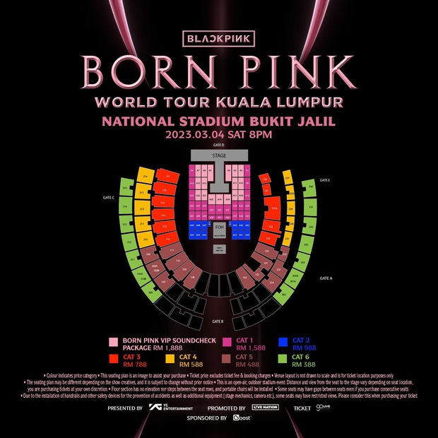 Theo công bố sơ đồ concert BORN PINK tại Malaysia, toàn bộ khu vực dưới sân khán giả đều sẽ được ngồi. Đặc biệt quy cách đánh số ghế được ban tổ chức quy định từ phải sang trái và từ nhỏ đến lớn bất kể cánh phải hay trái của sân khấu.