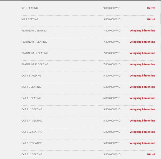 Trước đó, toàn bộ vé VIP 2 ngày concert BLACKPINK đã được bán hết sạch. Các hạng vé như Cat 1, Cat 2 và Platinum có trị giá từ 5,8 triệu cho đến 7,8 triệu vẫn còn đang được mở bán. Riêng với các hạng vé giá rẻ như 1,2 triệu, 1,8 triệu, 3,8 triệu cũng đã hoàn toàn sold-out.