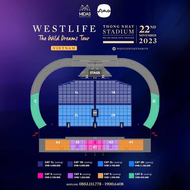 Tối 21/9, BTC The Wild Dreams Tour của Westlife tại Việt Nam đã chính thức công bố sơ đồ chỗ ngồi cũng như bảng giá vé. Concert của Westlife tại Việt Nam sẽ diễn ra vào tối 22/11 tại SVĐ Thống Nhất (TP.HCM).