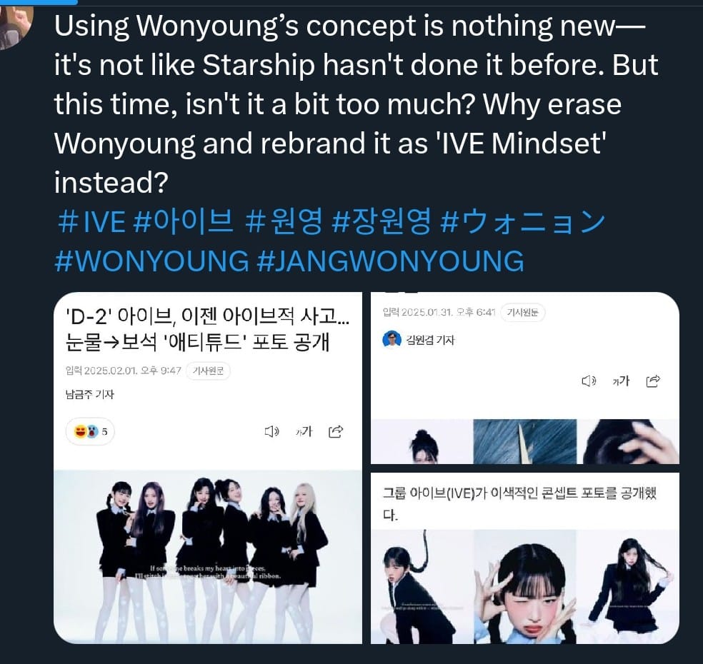 Người hâm mộ Jang Wonyoung đang thực hiện chiến dịch đòi lại công bằng cho thần tượng. Hàng loạt bài đăng “bóc mẽ” công ty chủ quản được đăng tải. Theo đó, fan chỉ ra Starship lợi dụng danh tiếng của Jang Wonyoung, dùng thương hiệu Jang Wonyoung và những xu hướng mà cô nàng tạo ra để làm thành “signature” cho nhóm, từ đó thúc đẩy doanh thu.