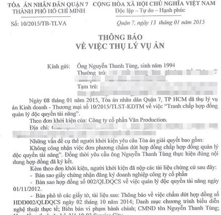 Tòa án nhân dân quận 7, TP.HCM đã thụ lý hồ sơ vụ kiện và thông báo đến nam ca sĩ "Không phải dạng vừa đâu" lên tòa để giải quyết vấn đề hợp đồng với Văn Production.