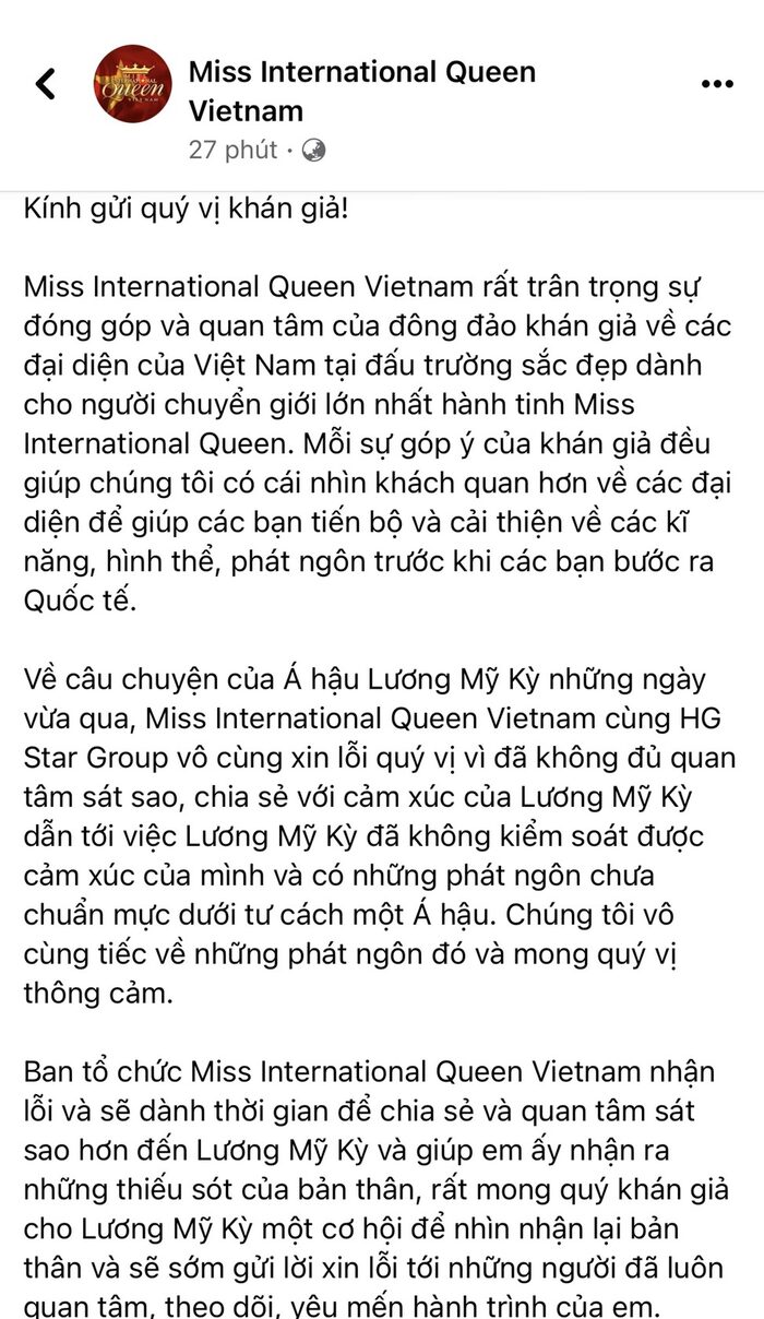 Rất nhanh chóng, ban tổ chức Miss International Queen Vietnam đã lên tiếng về sự việc. Trên fanpage chính thức, Miss International Queen Vietnam gửi lời nhận lỗi với hành động thiếu suy nghĩ của Á hậu Lương Mỹ Kỳ và hi vọng netizen cho nàng Á hậu một cơ hội để nhìn nhận những sai sót của bản thân.