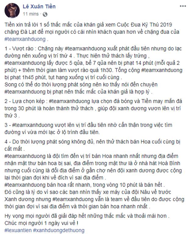 19/08/2019 22:32Cuộc đua kỳ thú: Lê Xuân Tiền lý giải vì sao về đích sau nhưng vẫn đứng nhất