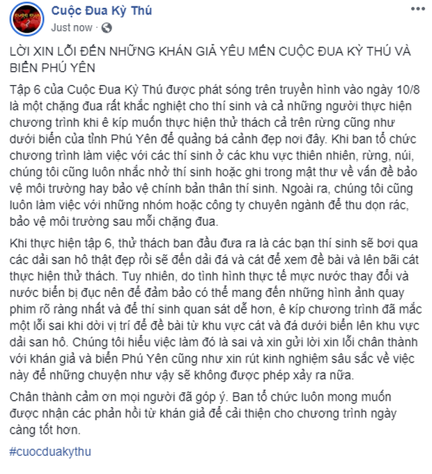 Trước phản ứng của khán giả, ekip Cuộc đua kỳ thú nhanh chóng đăng tải lời xin lỗi trên trang FanPage của chương trình. Theo đó, phía ekip giải thích rằng do mực nước biển thay đổi và bị đục nên họ đã đổi vị trí đề bài từ khu vực cát lên khu vực san hô. Tuy nhiên, lời xin lỗi của chương trình dường như chưa thể xoa dịu sự búc xúc của khán giả. Bởi điều mà người xem lên án là việc đặt bê tộng nặng lên dải san hô khiến tầng sinh vật này dễ bị hư hại.