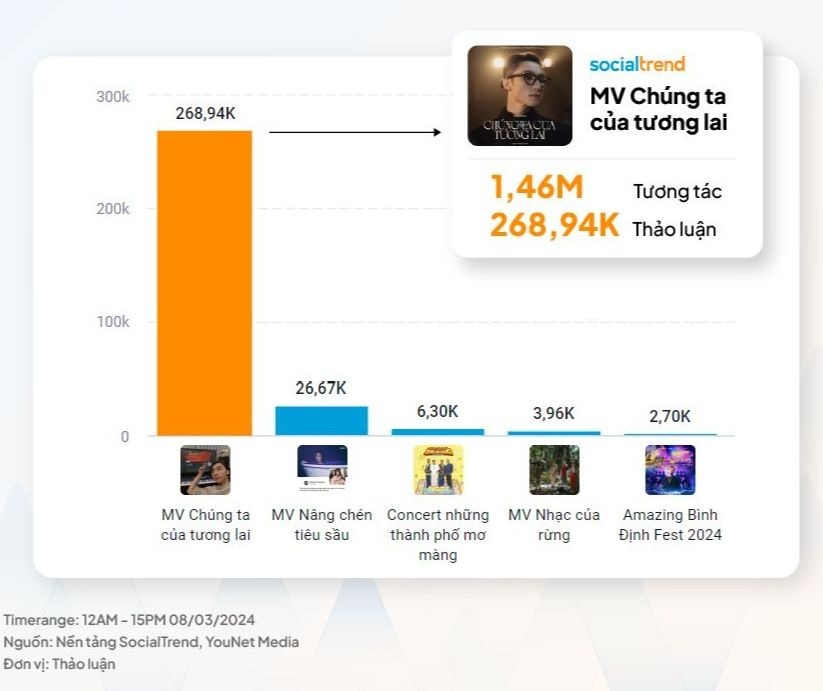 Chuyên trang đo lường khác là YouNet Media cho biết chỉ hơn 12 tiếng, MV Chúng ta của tương lai “viral” khắp mạng xã hội với lượng thảo luận gấp 10 lần so với MV ra mắt cùng ngày.