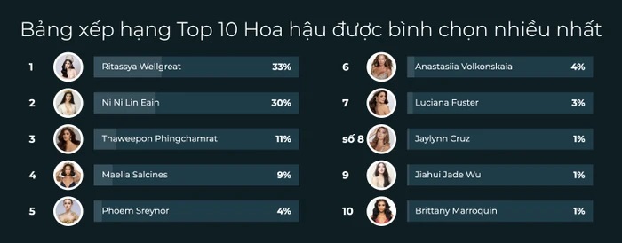 Đại diện đến từ Myanmar cũng đã theo sát sao với 30% lượt bình chọn. Lê Hoàng Phương - đại diện đến từ Việt Nam hoàn toàn vắng bóng tại bảng xếp hạng này.