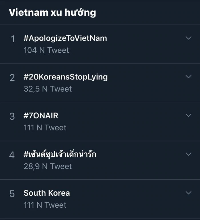 Điều này lập tức khiến dân mạng Việt Nam phẫn nộ và ngay trong đêm 25/2, hashtag #ApologizeToVietNam đã leo lên top 1 Twitter thế giới, theo sau là #20KoreansStopLying.