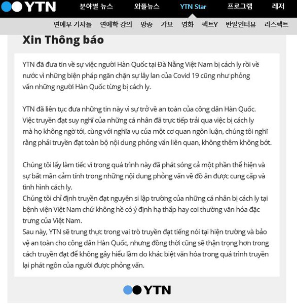 Thông báo bằng cả tiếng Việt lẫn tiếng Hàn được đăng tải trên trang web chính thức của đài YTN News. Dưới đây là toàn bộ nội dung thông báo bằng tiếng Việt: