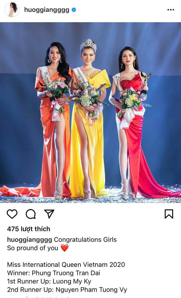 Ít phút sau khi công bố kết quả chung cuộc, Hương Giang liền có động thái đầu tiên dành cho đàn em: "Chúc mừng Phùng Trương Trân Đài đã trở thành Tân Hoa hậu chuyển giới Việt Nam 2020". Tuy nhiên, Hương Giang quyết không 'đả động' gì đến việc kết quả chung cuộc bị rò rỉ trước đó.