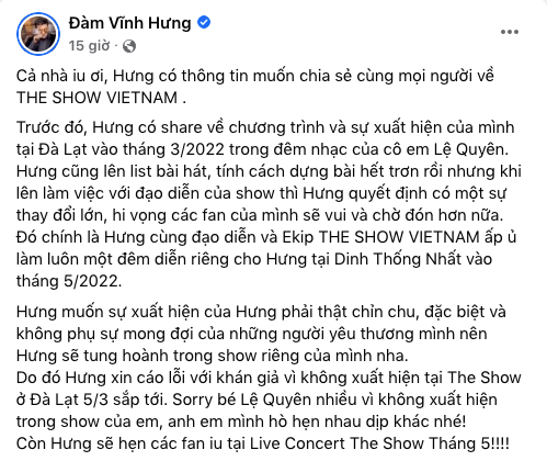 "Hưng muốn sự xuất hiện của Hưng phải thật chỉn chu, đặc biệt và không phụ sự mong đợi của những người yêu thương mình nên Hưng sẽ tung hoành trong show riêng của mình nha. Do đó Hưng xin cáo lỗi với khán giả vì không xuất hiện tại The Show ở Đà Lạt 5/3 sắp tới. Sorry bé Lệ Quyên nhiều vì không xuất hiện trong show của em, anh em mình hò hẹn nhau dịp khác nhé", Đàm Vĩnh Hưng cho biết thêm.