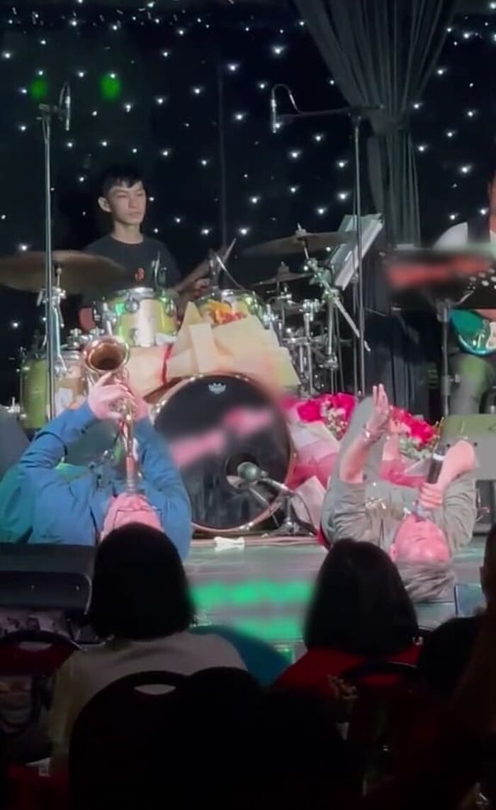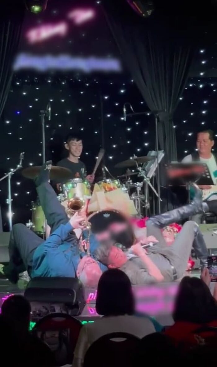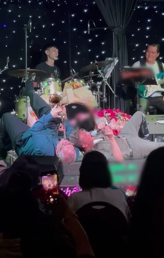 Cụ thể, nam nhạc công thổi kèn Saxophone đã nằm ngửa ra sân khấu để diễn cùng ban nhạc. Trong khi đó, Đàm Vĩnh Hưng cũng nằm ngửa ra bên cạnh để hát. Một lát sau, Đàm Vĩnh Hưng gối đầu lên người nam nhạc công và nằm với tư thế chân vắt ngang. Nhiều khán giả có mặt tại đêm nhạc đã dùng điện thoại để quay lại khoảnh khắc này.