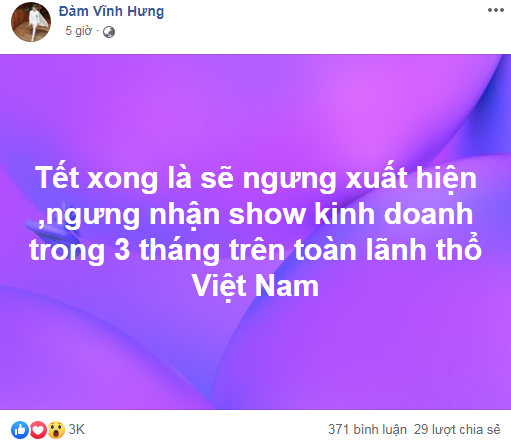 Trên trang cá nhân, nam ca sĩ Đàm Vĩnh Hưng vừa bất ngờ đưa ra thông báo sẽ tạm dừng mọi hoạt động tại Việt Nam trong vòng 3 tháng kể từ sau Tết 2020 sắp tới. Cụ thể Mr.Đàm sẽ không nhận show, không xuất hiện trên toàn lãnh thổ Việt Nam: "Tết xong là sẽ ngưng xuất hiện, ngưng nhận show kinh doanh trong 3 tháng trên toàn lãnh thổ Việt Nam" - Đàm Vĩnh Hưng chia sẻ.