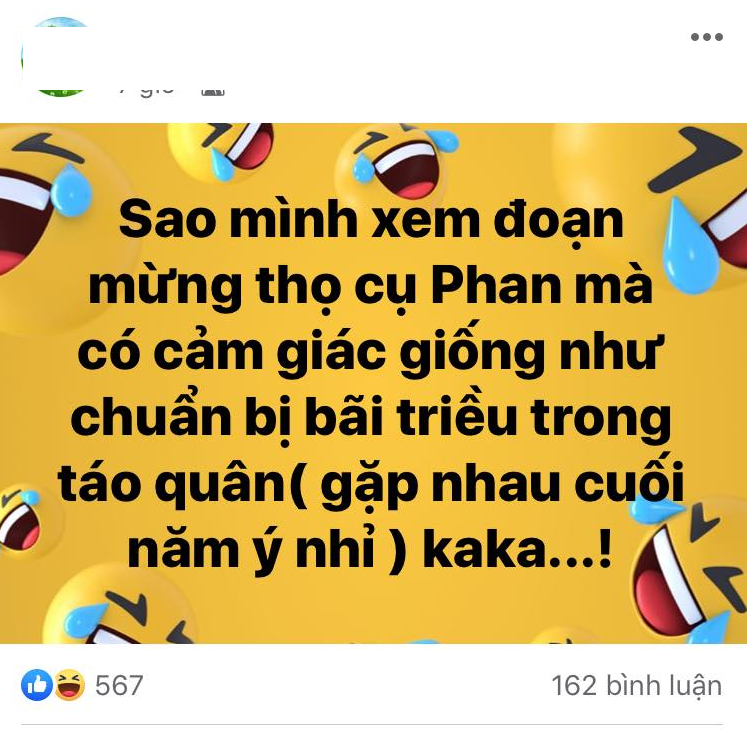 Màn độc thoại dài lê thê của cụ Phan khiến dân mạng lập tức liên tưởng đến cảnh cuối trong mỗi mùa Táo Quân khi Ngọc Hoàng dặn dò các 'Táo' và chuẩn bị tuyên bố 'Bãi triều'.