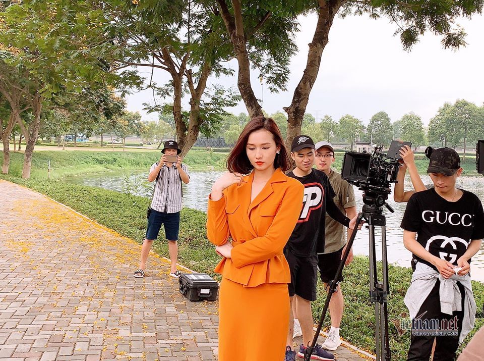 Lã Thanh Huyền kể với VietNamNet khi tranh thủ nghỉ ngơi giữa các cảnh quay chiều 9/6: "Thực sự là nóng muốn xỉu, nóng lả đi. Trời hôm nay có người trong ê kíp nói lên tới 50 độ C mà tôi phải mặc vest, mặc đồ mùa đông quay dưới trời nắng nóng cả ngày".