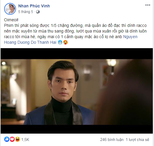 Không những vậy, Nhan Phúc Vinh đang phải thực hiện các cảnh quay dang dở của mùa đông, nhiều cảnh anh phải mặc áo vest, áo cổ lọ... dù thời tiết thực tế nóng như... rang.