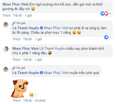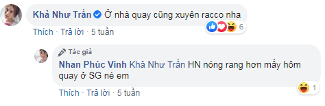 Trên mạng xã hội tối qua, Nhan Phúc Vinh và Lã Thanh Huyền cùng bình luận vào bài đăng của một thành viên trong ekip làm phim Tình yêu và tham vọng. Qua màn trò chuyện của hai diễn viên khán giả nhận thấy, vốn là người Hà Nội nên Lã Thanh Huyền đã quen với nắng nóng gay gắt, vì thế nên sau cả ngày quay phim mệt mỏi cô nàng vẫn có sức 'cày' hết tập phim Tình yêu và tham vọng trên VTV3 trong khi đó Nhan Phúc Vinh về nhà là 'ngất' 1 tiếng đồng hồ mới có sức dậy tẩy trang.