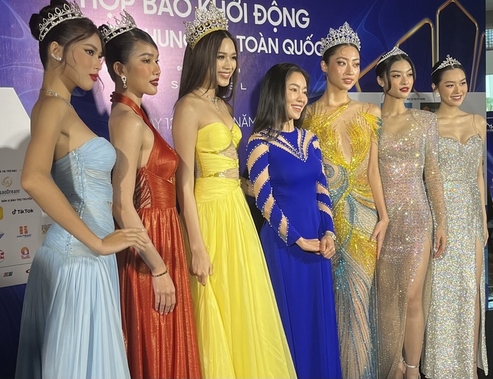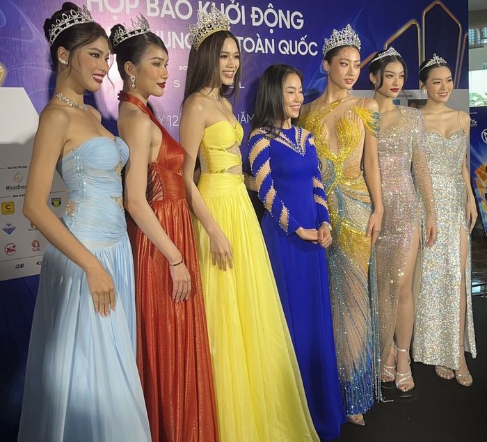 Tại thảm đỏ cuộc họp báo, dàn hậu xuất hiện lung linh trong những bộ trang phục lộng lẫy cùng Top 38 thí sinh có mặt tại đêm chung kết.