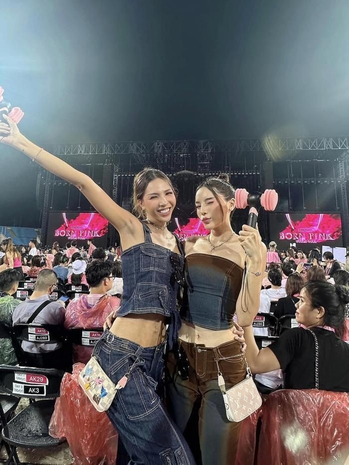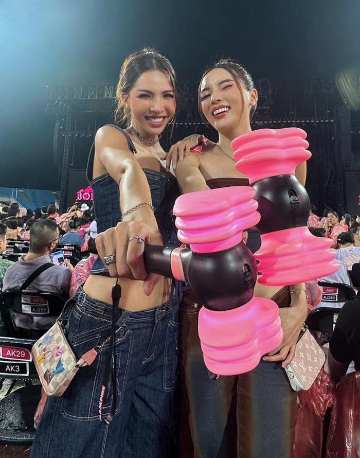 Hoa hậu Kỳ Duyên và người mẫu Minh Triệu mặc đồ gợi cảm, cầm phụ kiện búa hồng để cổ vũ nhóm nhạc BlackPink trong buổi trình diễn đầu tiên tối 29/7. Kỳ Duyên cho biết cả hai đều mến mộ Lisa, Rosé. Kỳ Duyên và Minh Triệu tự săn vé từ ngày đầu mở bán và khẳng định sẽ đi xem show của BlackPink. Sau khi xem trực tiếp, họ thấy thuyết phục và dành tình yêu lớn hơn cho những cô gái đen – hồng.