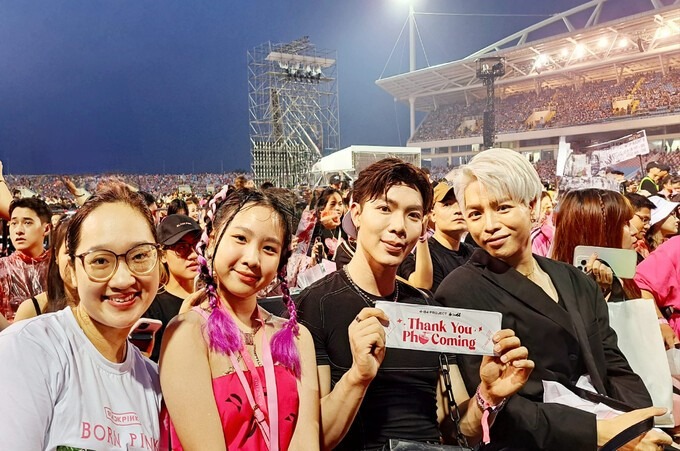 Á hậu Phương Nga check-in từ khu vực VIP. Cô là Blink chính hiệu. Trước đó, cô và chồng, diễn viên Bình An, từng bay sang Thái Lan xem show Born Pink hai đêm liên tiếp. Khi thần tượng về Việt Nam, người đẹp tiếp tục săn vé để xem đủ 2 show.