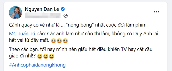 Nữ diễn viên còn đăng đàn hỏi dân mạng rằng liệu mình có nên giấu điều khiển TV hay cắt cầu dao điện hay không, nhằm ám chỉ để ông xã không xem được. Bên dưới bài đăng của Đan Lê, nhiều bạn bè vào trêu chọc cô. Có người còn hàm ý rằng đạo diễn Khải Anh có lẽ phải đập vỡ TV vì cảnh quay nóng bỏng của vợ, còn MC Tuấn Tú thì khổ sở nói rằng có lẽ mình sẽ bị hết vai sớm vì cảnh này.
