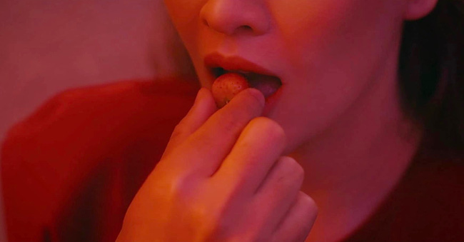 Ở cảnh này, Đan Lê tựa đầu vào vai Tuấn Tú thân mật. Cả hai cùng nhau... ăn dâu tây, nhưng ánh đèn mờ ảo cộng với góc quay zoom cận vào cảnh Đan Lê há miệng ăn dâu đầy gợi cảm khiến cảnh quay trở nên nóng bỏng.
