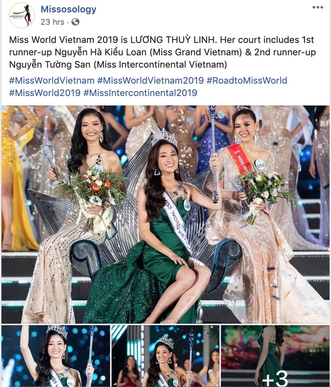 Sau khi Tân Hoa hậu Thế giới Việt Nam 2019 đăng quang, một số fanpage và chuyên trang sắc đẹp đã đăng tải hình ảnh của Lương Thùy Linh.