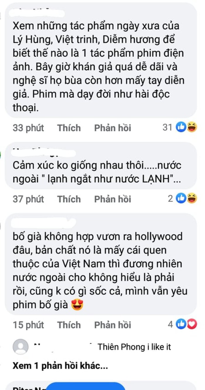 Sau khi trang đánh giá phim ảnh Rotten Tomatoes công bố điểm số mà Bố già nhận được dựa trên những lời nhận xét của giới phê bình, cư dân mạng Việt đã để lại những nhận xét về Bố già: