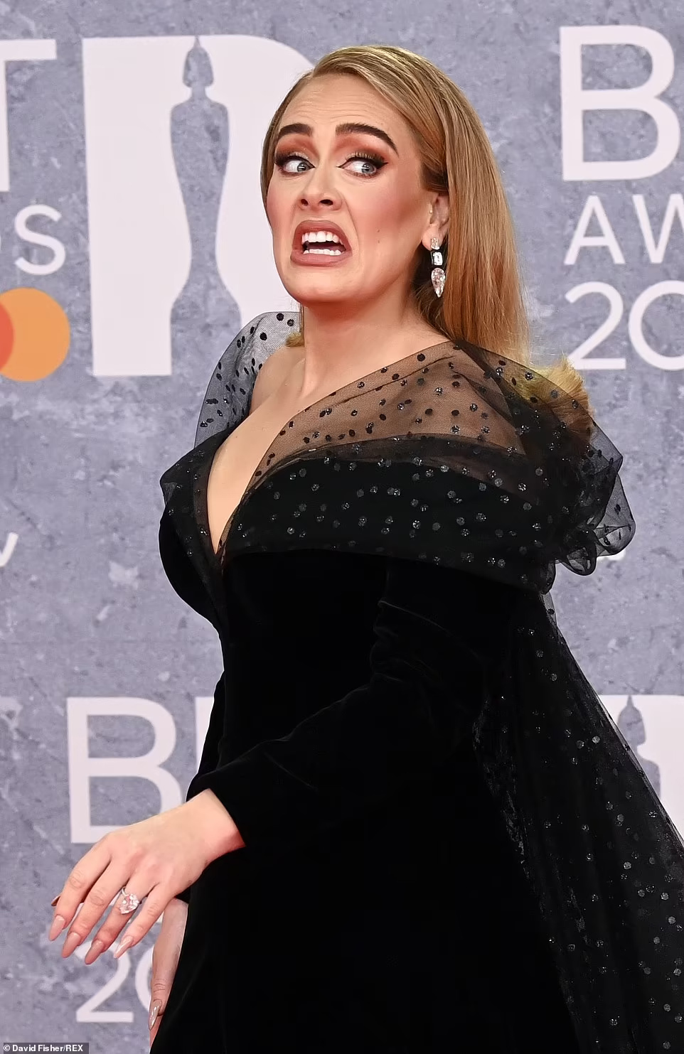 Ca sĩ Adele gợi cảm trong thiết kế xẻ ngực, ôm sát cơ thể. Đáng chú ý, cô vướng tin đồn đính hôn với bạn trai Rich Paul khi đeo nhẫn kim cương ở ngón áp út.