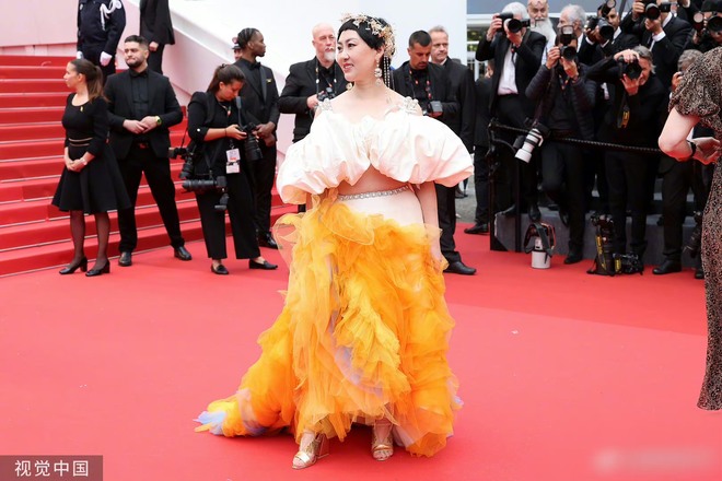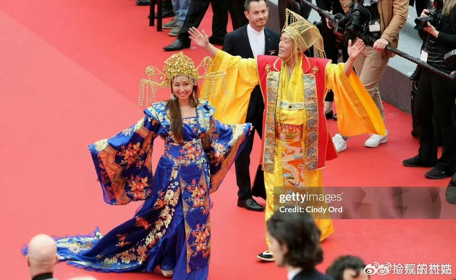 | Khách mời Trung Quốc diện trang phục độc lạ, múa may trên thảm đỏ Cannes trong tạo hình như Ngọc hoàng đại đế - Vương mẫu nương nương khiến khán giả bên ngoài không khỏi kinh ngạc, bật cười không ngớt |