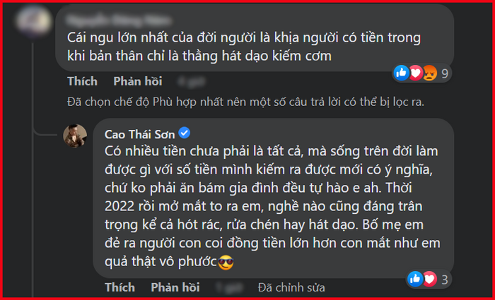 Dòng bình luận này đã nhanh chóng thu hút sự quan tâm đặc biệt của khán giả khi trực tiếp công kích vào Cao Thái Sơn. Nam ca sĩ cũng đã ngay lập tức để lại dòng bình luận đáp trả đầy "đanh thép": "Có nhiều tiền chưa phải là tất cả, mà sống trên đời làm được gì với số tiền mình kiếm ra được mới có ý nghĩa, chứ không phải ăn bám gia đình đều tự hào em à. Thời 2022 rồi mở mắt to ra em, nghề nào cũng đáng trân trọng kể cả hốt rác, rửa chén hay hát dạo. Bố mẹ em đẻ ra người con coi đồng tiền lớn hơn con mắt như em quả thật vô phước".