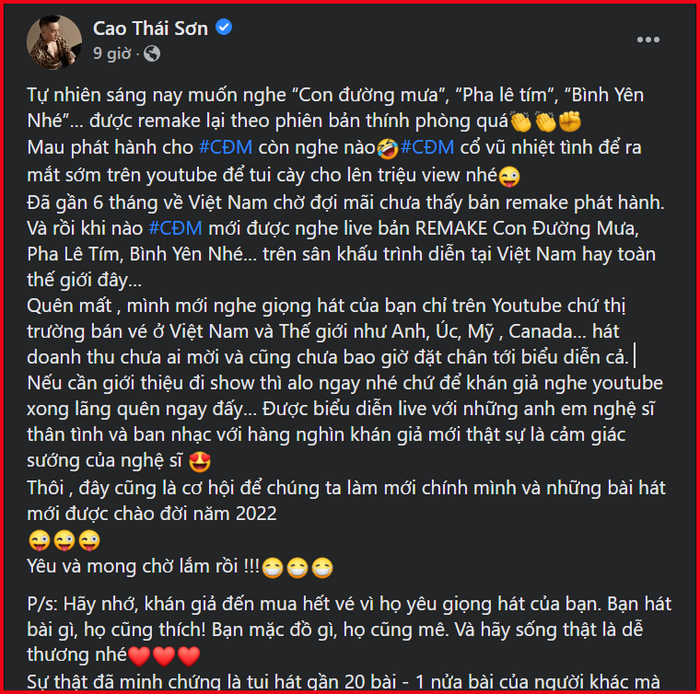 Nguyên văn bài đăng của Cao Thái Sơn trên trang cá nhân: "Tự nhiên sáng nay muốn nghe Con đường mưa, Pha lê tím, Bình yên nhé… được remake lại theo phiên bản thính phòng quá. Mau phát hành cho cộng đồng mạng còn nghe nào. Cộng đồng mạng cổ vũ nhiệt tình để ra mắt sớm trên YouTube để tôi cày view nhé.