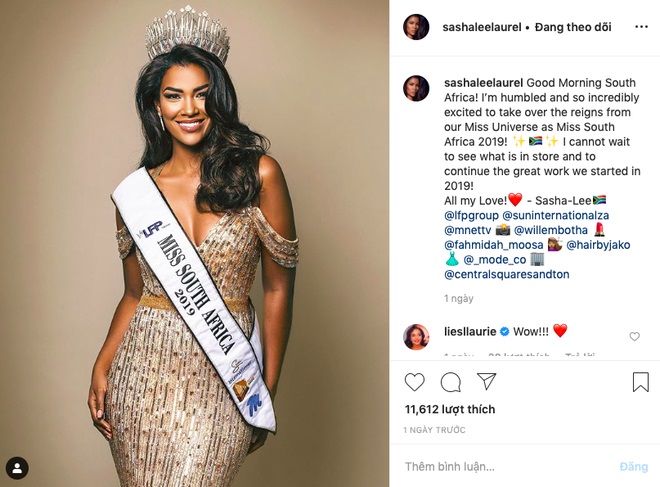 Sau khi chính thức đăng quang Miss Universe 2019 vào tháng 12 vừa qua, người đẹp Zozibini Tunzi mới đây đã quyết định chuyển giao lại ngôi vị Hoa hậu Nam Phi cho Á hậu 1 - Sasha Lee Olivier tại quê nhà. Lý do xuất phát từ việc hiện Zozibini Tunzi phải chuyển tới Mỹ sinh sống trong vòng 1 năm nên không thể tiếp tục đảm đương được nghĩa vụ của một Tân Hoa hậu tại quê hương.