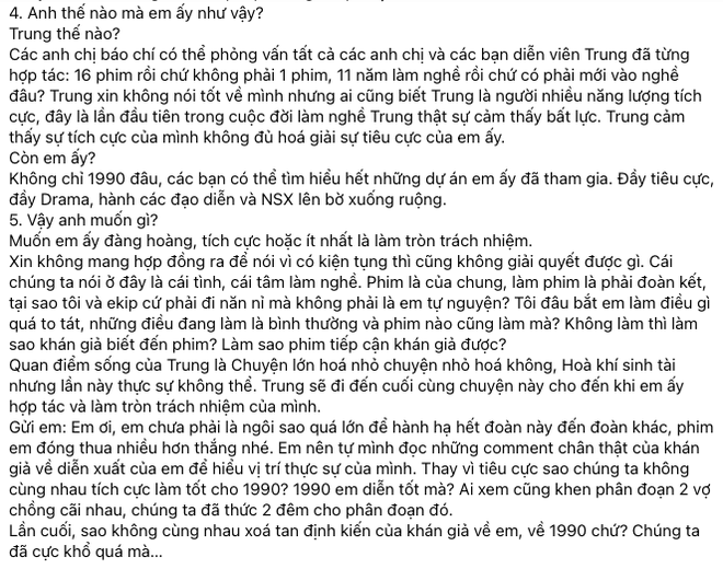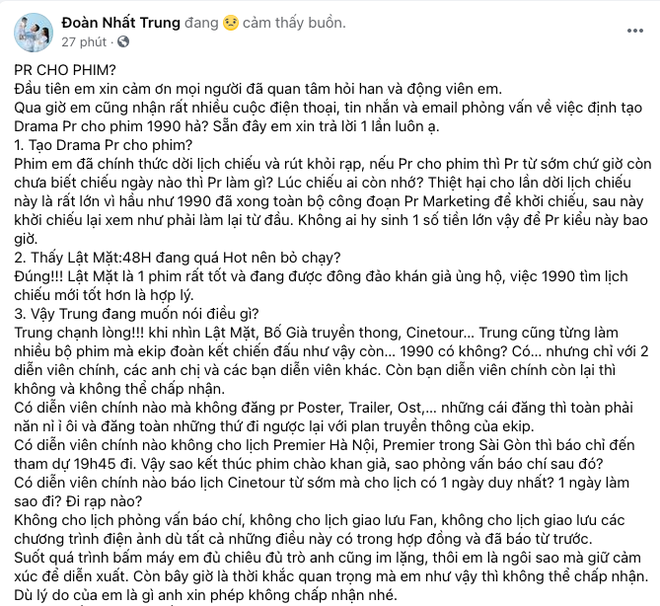 Ngoài ra, ở status này, đạo diễn Nhất Trung cũng chối bỏ các cáo buộc rằng mình đang lợi dụng điều tiếng để "PR bẩn" cho phim 1990, giải thích lý do dời lịch chiếu là vì thấy Lật Mặt: 48H đang quá hot.
