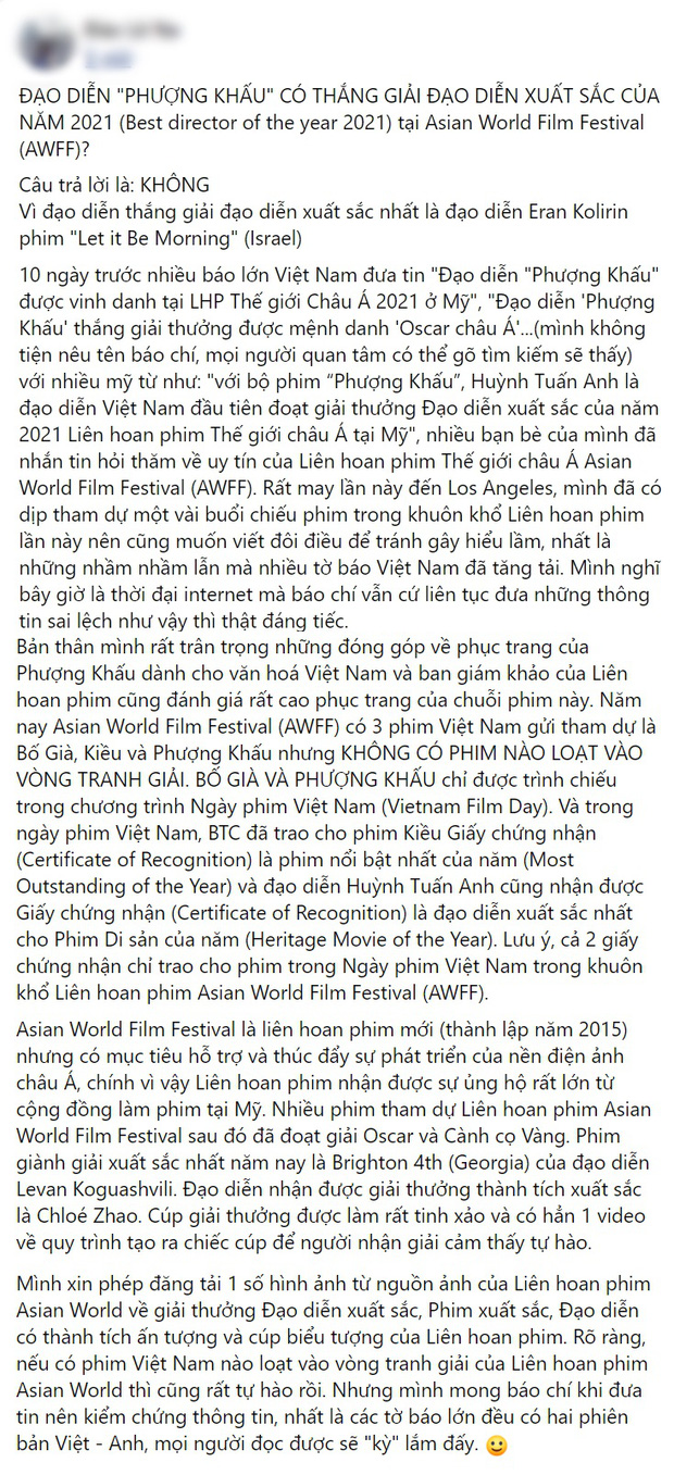 Tuy nhiên mới đây, một người trong giới làm phim đã đăng một dòng trạng thái khá dài trên trang cá nhân có nội dung xoay quanh việc Huỳnh Tuấn Anh có nhận được giải thưởng ở Liên hoan phim Thế giới châu Á 2021 hay không. Dù bài đăng khá dài nhưng thông tin quan trọng được người này hé lộ ngay ở những dòng đầu tiên. Theo đó, người này khẳng định Huỳnh Tuấn Anh không nhận được giải thưởng Đạo diễn xuất sắc của năm 2021 tại AWFF. Chủ nhân của giải thưởng này là đạo diễn Eran Kolirin phim Let It Be Morning (Israel).