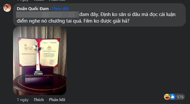 Trước những bình luận này, Doãn Quốc Đoan lập tức đăng ảnh chứng nhận Đào, Phở Và Piano thắng Bông Sen Bạc tại LHP Việt Nam 2023 vừa qua để 'đáp trả'.