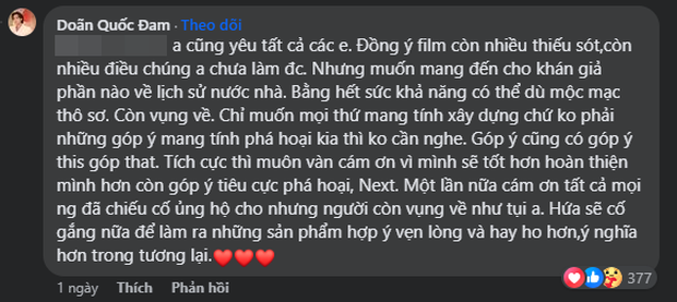 Doãn Quốc Đam sau đó chốt lại rằng anh không chê phim, chỉ công nhận rằng "phim còn nhiều thiếu sót, còn nhiều cái anh chưa làm được". Song, anh và ekip mong muốn mang lịch sử nước nhà đến gần hơn với khán giả, dù cho phương thức còn thô sơ, mộc mạc và vụng về. Những chia sẻ của Doãn Quốc Đam nhận được lời khen ngợi và tương tác cao của dân tình trên MXH.