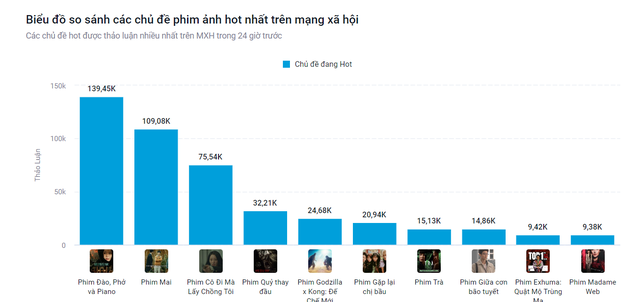 Cũng theo số liệu từ YouNet Media, trong ngày 20/2, Đào, Phở Và Piano đã vượt qua Mai, trở thành phim hot nhất mạng xã hội hiện nay. Tác phẩm tạo ra 152,9 nghìn lượt thảo luận và thu hút 1,41 lượt tương tác trong 24h. Đặc điểm là Mai hot nhất trên TikTok (47,6% thảo luận về phim là từ nền tảng TikTok), còn Đào, Phở và Piano hot nhất trên nền tảng Facebook (78% thảo luận từ Facebook).