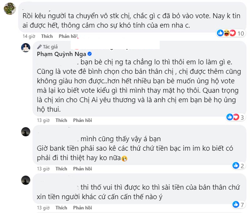 Đứng trước ý kiến trái chiều, Quỳnh Nga liên tục phản pháo khiến netizen gay gắt hơn cho rằng cô khiếm nhã xin tiền công khai. Song cũng có nhiều fan bênh vực cô nàng rằng “nếu chuyển tiền mà cô không thực hiện vote thì Quỳnh Nga mới là người chịu thiệt. Vì thế hãy tin tưởng và ủng hộ idol thôi”.