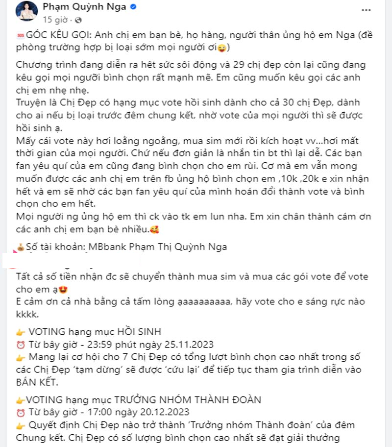 Cụ thể, trên Facebook cá nhân, Quỳnh Nga đã bắt đầu kêu gọi người thân, bạn bè và fan bình chọn cho cô khi bước sang chặng thứ 2 của Đạp Gió:
