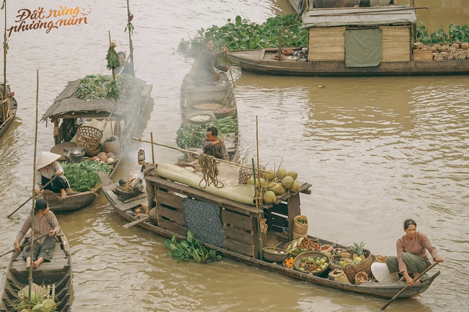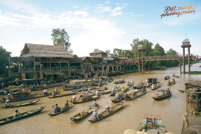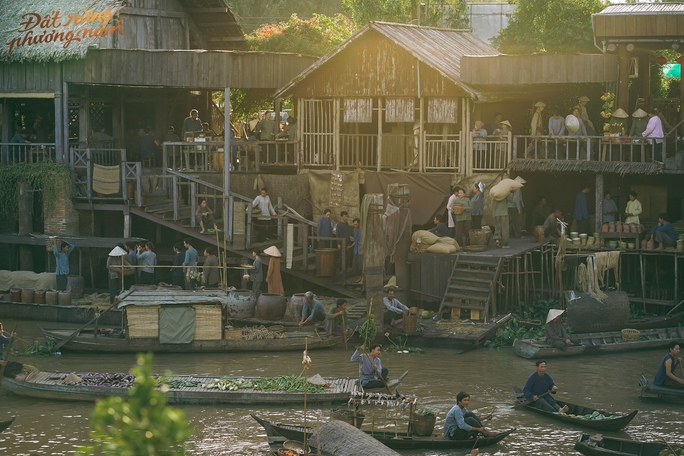 Trong loạt ảnh hậu trường, một cổng chợ bề thế được dựng lên với biển hiệu của các cửa tiệm được vẽ tay mang nét cổ xưa như "Tiệm vàng - cầm đồ Kim Sang"... Trên các thuyền ghe xuôi ngược, hàng hóa được chất đầy, tất cả đều tất bật mua mua bán bán, thể hiện được không khí sôi động của khu chợ nổi sầm uất.