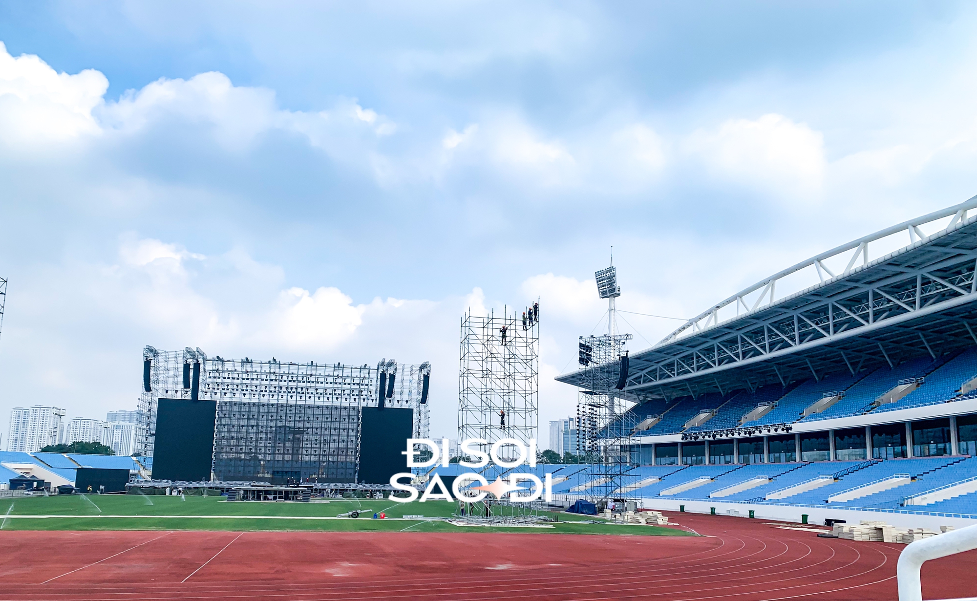 Dàn loa, đèn, những khung dàn giáo cao ngất đã được di chuyển ra địa điểm tổ chức. Các hạng mục màn hình LED, khu vực kỹ thuật FOH cũng đã được xây lắp để đảm bảo quá trình kiểm tra trước thềm đêm diễn.