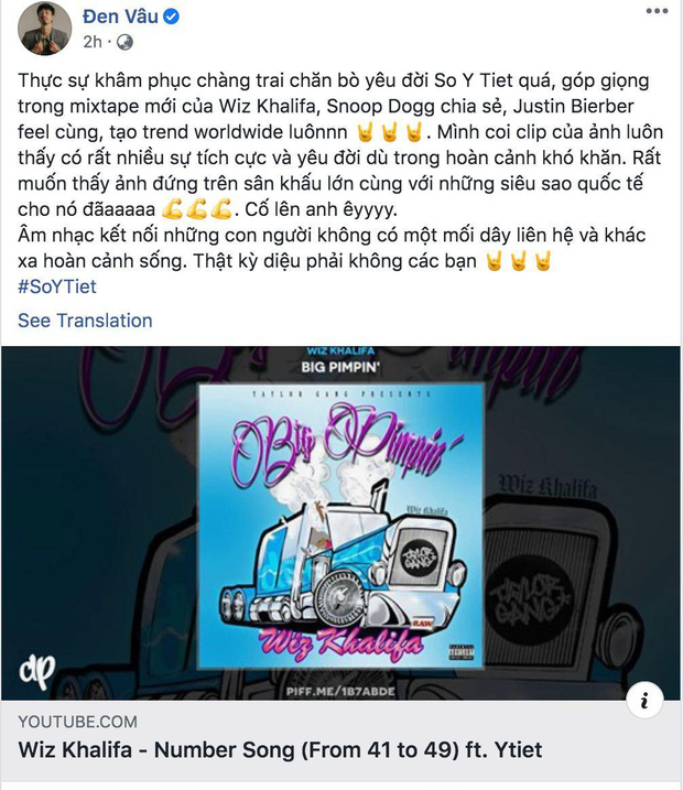 Những ngày gần đây, anh chàng chăn bò hiện tượng mạng Soytiet đang là cái tên được cư dân mạng chú ý đặc biệt khi được hợp tác với rapper nổi tiếng tầm cỡ thế giới Wiz Khalifa, mix lại ca khúc đếm số rồi còn được cả Justin Bieber thích thú cover lại cực "chill". Không chỉ khán giả cảm thấy lạ lẫm, sửng sốt mà đích thân Đen Vâu cũng đã đăng tải dòng trạng thái thể hiện sự ủng hộ của nam rapper này với Soytiet.