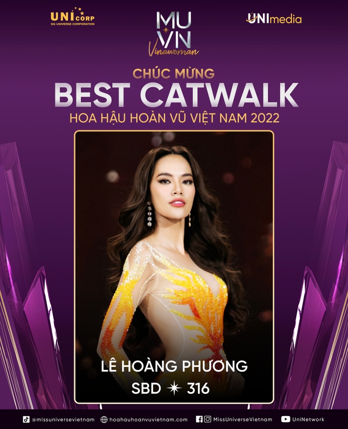 Bên cạnh sự so sánh giữa Thảo Nhi và Thuý Vân, nhân vật thứ hai được điểm mặt gọi tên sau chương trình là Lê Hoàng Phương. Nếu như năm 2019, cô chỉ giành danh hiệu Người đẹp biển, thì ở cuộc thi năm nay, điềm báo hoa hậu xuất hiện khi Lê Hoàng Phương nhận giải thưởng Best Catwalk giống Hoa hậu Khánh Vân của năm 2019.